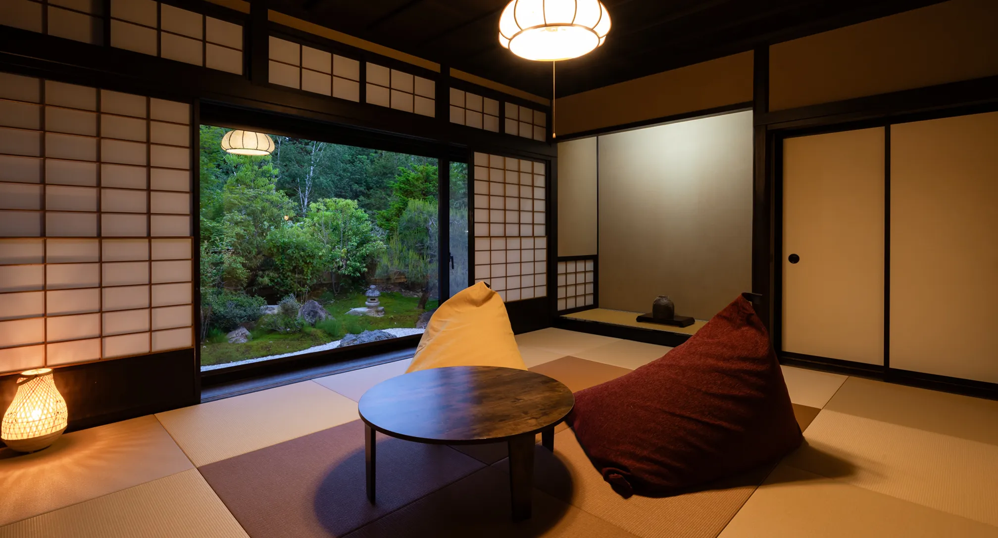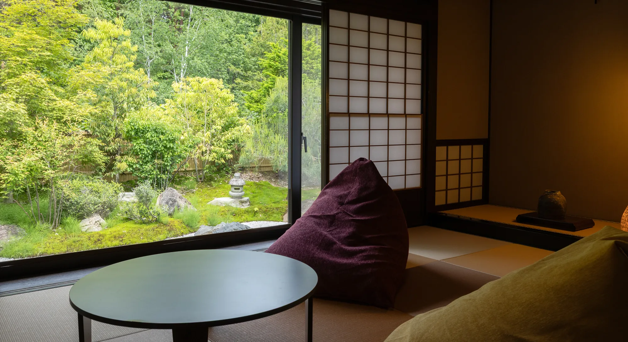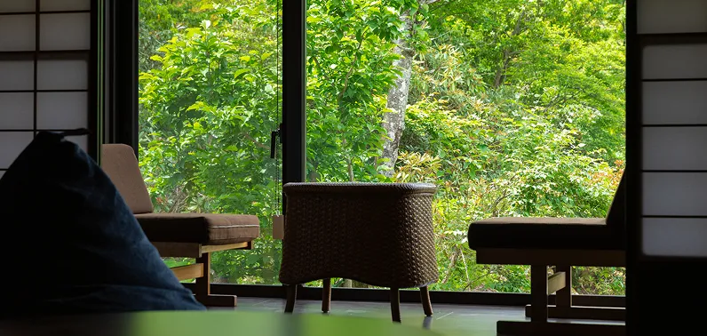 障子からやわらかく差し込む自然光と、緑あふれる景色が調和し、まるで絵画の中にいるかのような心地よさを演出します。