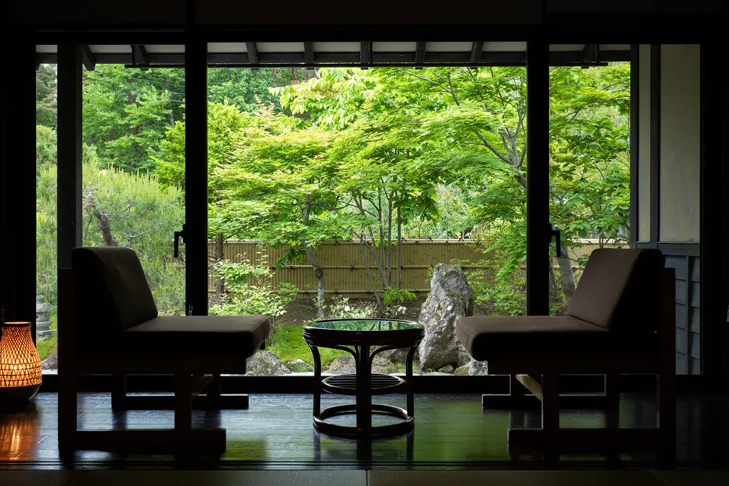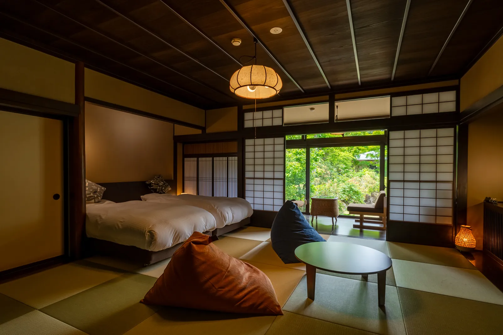 A relaxing Japanese-style room overlooking the garden, enveloped in the warmth of Japan